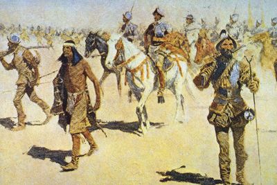 The earliest explorers of European extraction to visit the area were Spanish explorers such as Coronado. However, the Coronado expedition of 1540–42 only skirted the future border of the Colorado Territory to the south and southeast.The lands that comprised the Colorado Territory were primarily inhabited by the Ute from Western Colorado onto the high eastern plains and Anasazi in southwestern, southern, and part of southeastern Colorado. The Comanche and Jicarilla Apache also formally ruled over the southeastern portions of the state. Arapaho and Cheyenne also hunted, warred, and sometimes lived in the eastern and northeastern plains of the state as well. In 1776, Francisco Atanasio Domínguez and Silvestre Vélez de Escalanteexplored southern Colorado in the Dominguez-Escalante Expedition. In 1779, Governor de Anza of New Mexico fought and defeated the Comanches under Cuerno Verdeon, the Eastern Slope of Colorado, probably south of Pueblo. In 1786, de Anza made peace with the Comanches, creating an alliance against the Apaches. In the south, in the San Luis Valley, early Mexican families established themselves in large land grants (later contested by the U.S.) from the Mexican government. In the early 19th century, the upper South Platte River valley had been infiltrated by fur traders but had not been the site of permanent settlement. The land, which ultimately became the Colorado Territory, had first come under the jurisdiction of the United States in three stages: